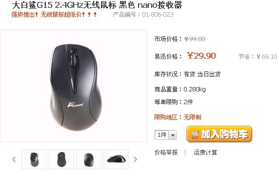 即蝰蛇跌至189,狂蛇跌至129后!大家注意了,易迅让利特价第三弹到来了!!! 无线鼠标史上最低价,切莫错过,大白鲨G15售价29.9免运费,这个价格您还犹豫什么?