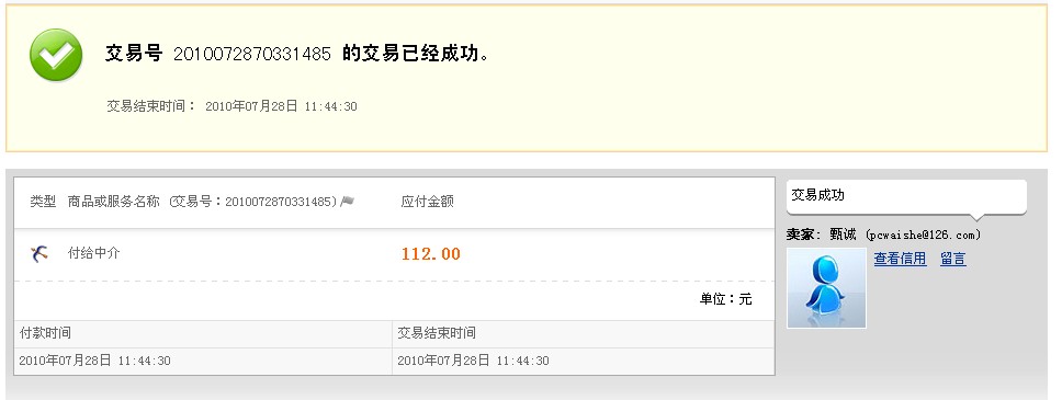本帖最后由 硬件毛虫 于 2010-8-1 19:08 编辑 东西已收到 测试使用正常 请红版放款吧! 请将110元打给卖家 剩下的2元打回我支付宝 sky59453721@yahoo.cn 施冰 谢谢红版! 卖家人很不错 很实在的一哥们 和他交易非常愉快! |