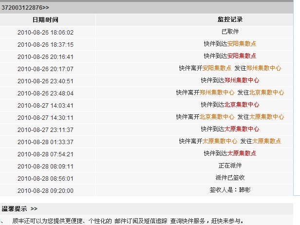 顺丰单号: 372 003 122 876 买家注意:因为今天比较忙,所以在家发的顺丰(有时间的话我是会去电脑商场我朋友那里发,因为我觉得在哪里可以包的结实,而且负责那片的快递员收回去的货大部分是电子产品会比其他地方要小心),因为这个快递员说发键盘这东西是易碎如果出了问题不负责,我不放心,所以我给你买了保价,因为到付保价必须和运费一起付,我把3块钱的保价费放到键盘盒子里了(钱在PS/2口隔板下面)他说回去再给我包一下,我简单的用一个方便面箱子包了一下~到付的费用是28,一共31。请注意查收! |