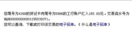 已网上银行汇款165元 交易流水号 HQH000000000001295039371 |