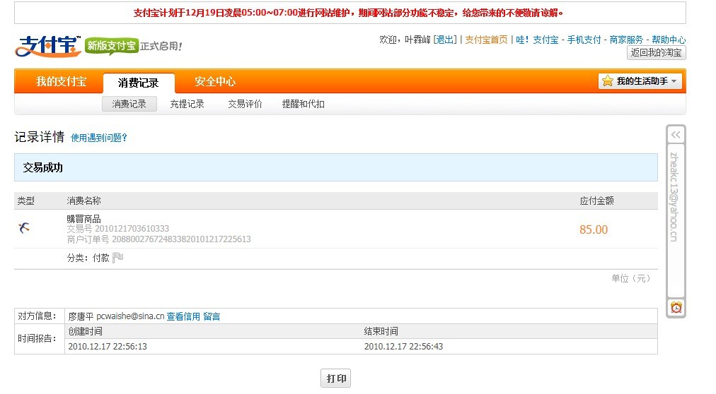 到账 85 元,卖家可以发货。 |