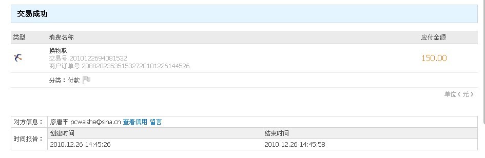 已付款到中介版主 支付宝上 您已成功付款150.00 元 ! 中介版主查收 |