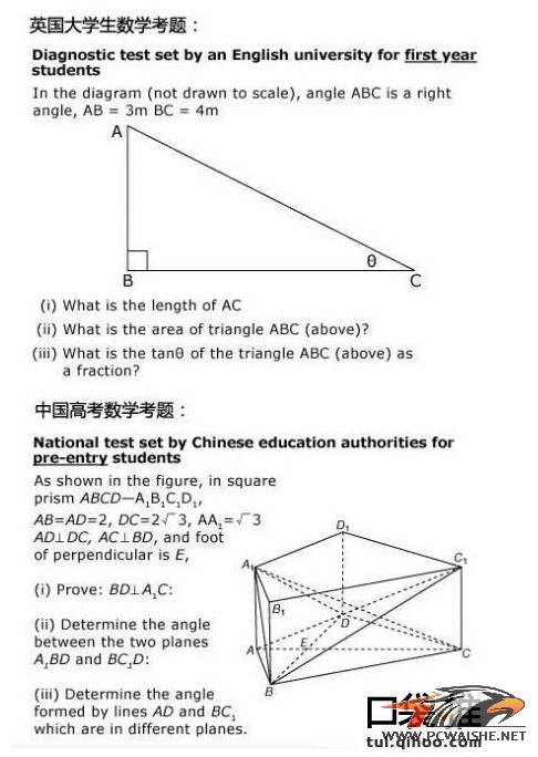 中国高考和英国大学生的数学考题差距?!真是这样的吗?悲催啊,做梦都会梦到高考数学,泣血ing…… 英国 数学考试题 第一题 问 AC的长多少 答 5....... 第二题 问 △ABC面积多少 答 6...... 第3 ...