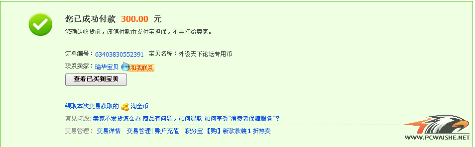 您好,请在淘宝上直接确认到货,然后我才能确认到帐。 交易双方请认真看操作流程:http://www.pcwaishe.cn/forum-45-1.html 如果您没有按操作流程进行,那么将大大浪费您的时间。 |