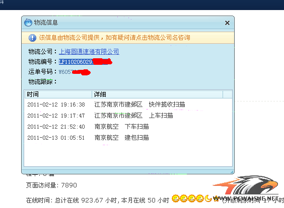 2011-02-12 18:58:13 上海市浦东花木 快件揽收扫描 2011-02-12 20:50:23 上海市浦东分拨中心 下车扫描 2011-02-12 23:00:27 上海市浦东分拨中心 建包扫描 2011-02-14 07:14:43 深圳分拨中心 下车扫描 2011-02-14 07:15:11 深圳分拨中心 上车扫描 2011-02-14 07:22:31 广东深圳 上车扫描 2011-02-14 08:19:36 广东深圳西丽 下车扫描 2011-02-14 08:52:25 广东深圳西丽 派件扫描,派件人是 2011-02-14 13:57:34 广东深圳西丽 签收扫描,签收人: |