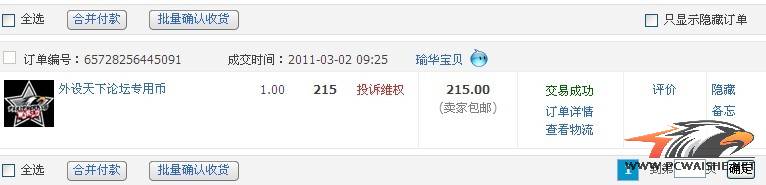 卖家:zyj 买家:terryyule 交易金额:215元包申通 帖子地址: http://www.pcwaishe.cn/thread-153142-1-1.html