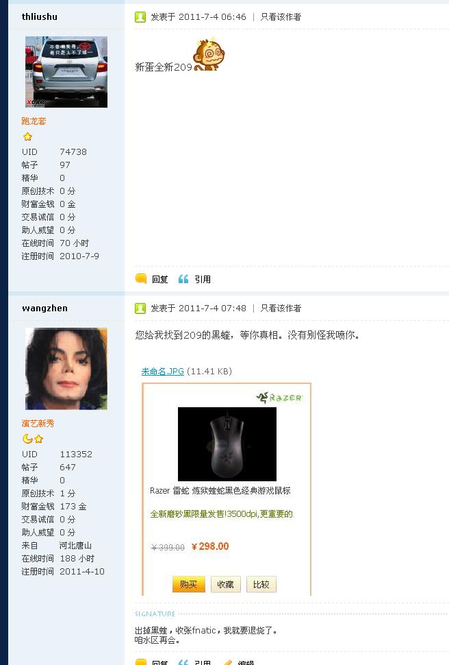 我跟那200到付出95+黑蝰,那SB跟帖说X蛋全新209,我想不可能啊,跑去X蛋看了看,298。当时我就火了。你丫是不是SB,脑瓜儿让门夹了还是肿木地?你可以说我的价不好甚至可以喷我。你拿一虚无缥缈的东西诋毁我,就不行 ...