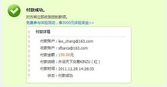 付款成功。 对方将立即收到您的款项。 免费参与体验活动,拿3000元体验奖金>> 付款详情 付款账户: leo_chang@163.com 收款账户: sfbarca@163.com 付款金额: 150.00元 付款说明: 外设天下交易KINZU(红) 付款时间: 2011.12.28 14:28:35 状态: 付款成功 |