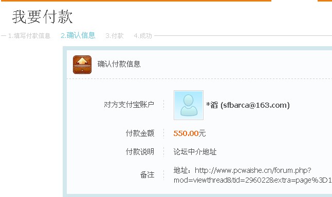 付款成功。 对方将立即收到您的款项。 付款详情 付款账户: babybabys2007@yahoo.cn 收款账户: sfbarca@163.com 付款金额: 550.00元 付款说明: 论坛中介 付款时间: 2012.02.10 11:14:48 状态: 付款成功 您可能需要: 查看付款记录 | 继续付款 | 返回我的支付宝 恭喜您,本次转账的成长点已发放。查看成长点明细 和我的等级 |