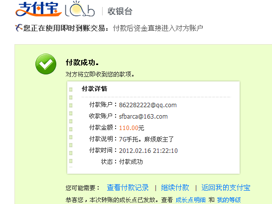 已经放款 ! 交易的双方可以去申请诚信分。 地址:http://www.pcwaishe.cn/forum-46-1.html 付款成功,转账到银行卡申请已提交,正在处理。 如果银行信息填写错误资金将自动退回您的付款账户(银行卡或支付宝账户)。 付款成功 2012-02-21 21:33 提交到银行处理 2012-02-21 21:34 银行处理完成,转账成功 2012-02-22 24:00 前到账 转账详情 到账银行信息: 李惠子 中国建设银行 (**** **** **** 5997) 到账金额: 109.10 元 服务费: 0.90 元 备注: 转账 付款时间: 2012/02/21 21:33 到账时间: 2012/02/22 24:00 前 付款人: 户滔 (sfbarca@163.com) 了解转账到银行卡更多新功能>> 继续转账 | 查询转账记录 | 提点建议 | 返回我的支付宝 恭喜您,本次转账的成长点已发放。查看成长点明细和我的等级 |