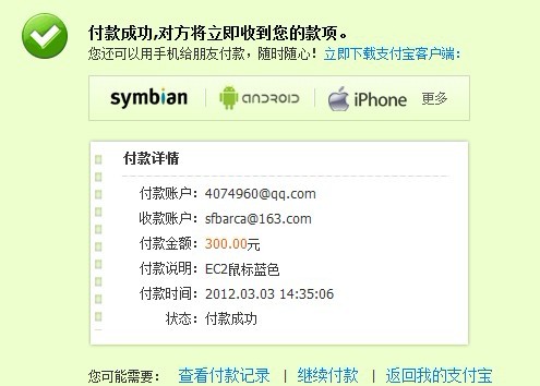 已经放款 ! 交易的双方可以去申请诚信分。 地址:http://www.pcwaishe.cn/forum-46-1.html 付款成功,转账到银行卡申请已提交,正在处理。 如果银行信息填写错误资金将自动退回您的付款账户(银行卡或支付宝账户)。 付款成功 2012-03-07 20:33 提交到银行处理 2012-03-07 20:34 银行处理完成,转账成功 2012-03-08 24:00 前到账 转账详情 到账银行信息: 孙井阳 中国工商银行 (**** **** **** 2646) 到账金额: 299.10 元 服务费: 0.90 元 备注: 转账 付款时间: 2012/03/07 20:33 到账时间: 2012/03/08 24:00 前 付款人: 户滔 (sfbarca@163.com) 了解转账到银行卡更多新功能>> 继续转账 | 查询转账记录 | 提点建议 | 返回我的支付宝 恭喜您,本次转账的成长点已发放。查看成长点明细和我的等级 |