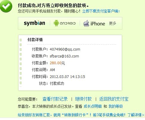已经放款 ! 交易的双方可以去申请诚信分。 地址:http://www.pcwaishe.cn/forum-46-1.html 付款成功,转账到银行卡申请已提交,正在处理。 如果银行信息填写错误资金将自动退回您的付款账户(银行卡或支付宝账户)。 付款成功 2012-03-10 20:16 提交到银行处理 2012-03-10 20:17 银行处理完成,转账成功 2012-03-11 24:00 前到账 转账详情 到账银行信息: 全云宁 中国工商银行 (**** **** **** 7603) 到账金额: 279.10 元 服务费: 0.90 元 备注: 转账 付款时间: 2012/03/10 20:16 到账时间: 2012/03/11 24:00 前 付款人: 户滔 (sfbarca@163.com) 3月转账到银行卡,2000元以内现金转多少送多少,立即去领福袋>> 继续转账 | 查询转账记录 | 提点建议 | 返回我的支付宝 |