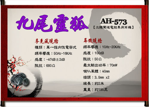 ALTEAM 九尾灵狐 ! 常见的耳麦玩家用的蛮多,评测什么的比较详细! 这款貌似没人用!有了解的说说音质!价格貌似300RMB AH-573M规格 耳机规格 频率响应:10Hz~20KHz 感度:100dB ...