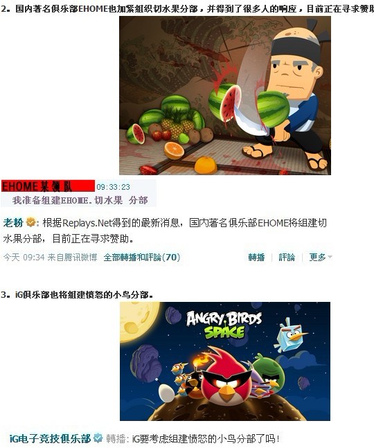 目前EHOME正在筹备自己的切水果战队 IG也在准备自己的愤怒小鸟队 难道WE已经有TOM猫战队,TYLOO有美女**队了吗