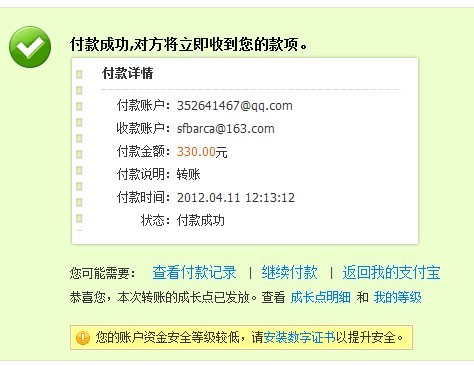 已经放款 ! 交易的双方可以去申请诚信分。 地址:http://www.pcwaishe.cn/forum-46-1.html 付款成功,转账到银行卡申请已提交,正在处理。 如果银行信息填写错误资金将自动退回您的付款账户(银行卡或支付宝账户)。 付款成功 2012-04-15 18:16 提交到银行处理 2012-04-15 18:17 银行处理完成,转账成功 2012-04-16 24:00 前到账 转账详情 到账银行信息: 中国工商银行 中国工商银行 (**** **** **** 2646) 到账金额: 329.10 元 服务费: 0.90 元 备注: 转账 付款时间: 2012/04/15 18:16 到账时间: 2012/04/16 24:00 前 付款人: 户滔 (sfbarca@163.com) 继续转账 | 查询转账记录 | 提点建议 | 返回我的支付宝 恭喜您,本次转账的成长点已发放。查看成长点明细和我的等级 |