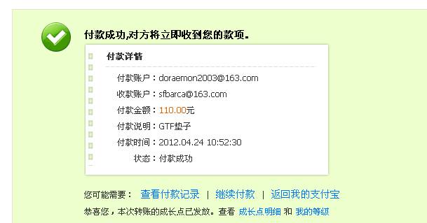 类型 消费名称 应付金额 即时到账交易 转账 交易号 2012042951160928 商户订单号 13357147678691860 110.00 分类:付款 单位(元) 对方信息: 陈志勇 doraemon2003@163.com 查看信用 | 留言 | 订阅该服务商 已有人订阅了该服务商,点击立即订阅。 | 查看专享服务 该服务商有条专享服务,点击立即查看。 时间报告: 创建时间 付款时间 结束时间 2012.04.29 23:52:47 2012.04.29 23:55:37 |