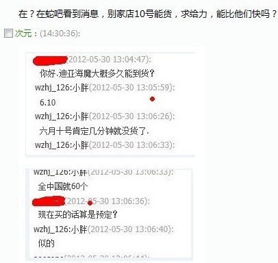 本帖最后由 没有终点 于 2012-6-8 02:39 PM 编辑 以为他们店雷蛇省级代理多牛B,去他们店预定迪亚海魔,说6月初到,6月1号问他们跟我说6月10号到,今天去看,人家7号都收到1件了,出了8件就发了1件,当时火气就来 ...