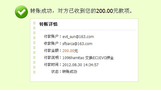 转账成功,对方已收到您的200.00元款项。 转账详情 付款账户: sfbarca@163.com 收款账户: evil_sun@163.com 付款金额: 200.00元 付款说明: 转账 付款时间: 2012.09.04 10:16:14 状态: 转账成功 |