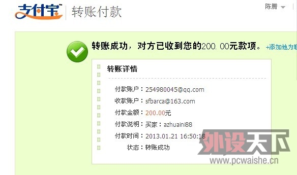 中介版主 发表于 2013-1-21 17:47 已经如数到账,卖家可以发货。