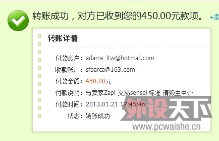 中介版主 发表于 2013-1-22 09:38 已经如数到账,卖家可以发货。
