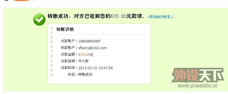 转账成功,对方已收到您的70.00元款项。 +添加他为联系人 转账详情 付款账户: sfbarca@163.com 收款账户: 499529627@qq.com 付款金额: 70.00元 付款说明: 转账 付款时间: 2013.03.18 09:54:13 状态: 转账成功 |