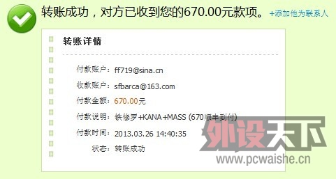中介版主 发表于 2013-3-27 09:54 已经如数到账,卖家可以发货。