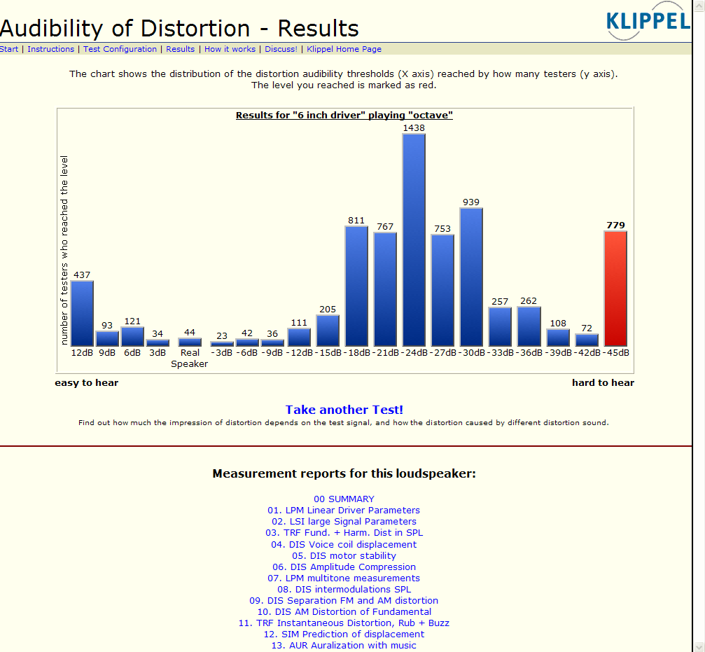 .点右下方的take the test开始测试! ! (如果第一次测试:I have previous experience with such a test:选no,如果第二次测试则选yes,避免混淆!!)主要考查你耳朵对细节的把握。 2.点上部的,sample A和sample B进行听音测试,如果觉的那个失真就点那个,比如A失真就点(A is Distorted),就是挑选失真的那个选上就ok啦 测试一共有12dB~-45dB,如果你过-18dB,那恭喜你可以买中端耳机啦,如果你过-30dB恭喜你是準金耳朵了,买高端產品才对得起自己的耳朵,要是你连-12dB都没过,恭喜你是木耳 |