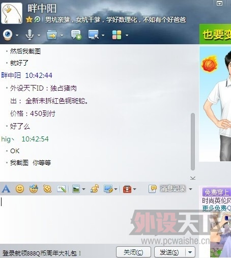 本帖最后由 中介版主 于 2013-6-17 09:47 编辑 买家ID:istlmrov 卖家ID:独占猪肉 交易:红色全新未拆铜斑蛇。 价格:450到付。 ps。由于卖家平常上班比较忙,没时间开交易帖,所以我们QQ交流好了,然后我截 ...