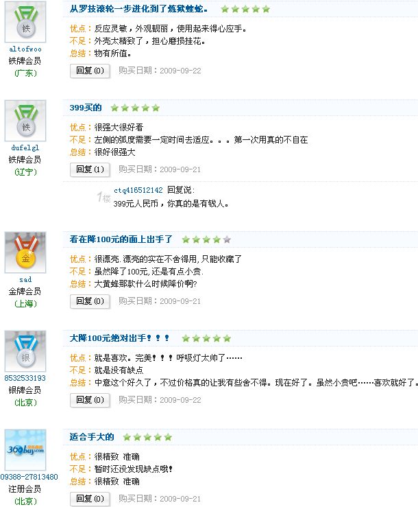 当哥完成一个又一个爆头,被无数人骂做开挂的时候,哥心里明白,他们用的都是垃圾鼠标;当哥APM冲上300,让哥4核 8G GT260的机器也开始卡屏,哥也明白,这个时代还找不到匹配这神兵利器的机器;拥有它,哥却有了高处不胜寒的寂寞,仿佛它银白的外表,冷静肃穆;还有那莹白的呼吸灯,犹如哥纵身千军万马却依旧平和的心跳,哥已无话可说,哥最大的错误就是太早遇到了生命里最后的鼠标--RAZER炼狱蝰蛇威震天版 {:1_028:} |