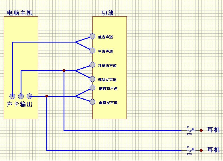 由于我的是游戏设备,电脑输出6声道,前置左右声道是输出其中一个玩家的音乐,环绕左右声道是输出另一个玩家的音乐,同时两个玩家都可以查耳机听音乐。即音乐既要接到功放输出到喇叭,又可以通过耳机接听音乐!我的 ...