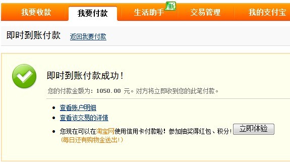 | 支付宝到账 1050 元,卖家可以发货。卖家的收款方式是银行还是支付宝,仅说明下是银行还是支付宝即可。如果不跟贴说明,那么放款时间将推迟。 |