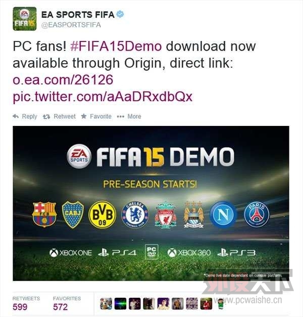 外设天下讯 9月10日消息,今天凌晨2点,EA Sports下代足球模拟游戏《FIFA 15》Demo终于发布PC版,最低要求为64位Win7/Win8.1和DX11显卡,彻底放弃XP市场,同时也带来真正游戏变革,为PC玩家带来更高视觉享受, ...