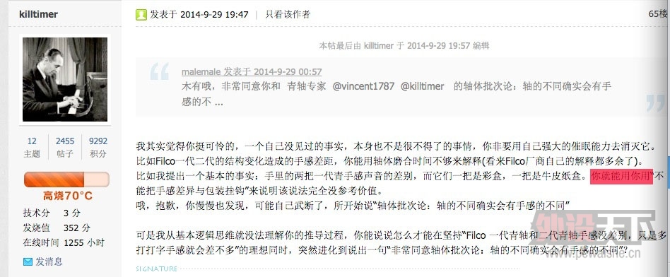 killtimer 发表于 2014-10-5 01:34 首先,前辈的帖子我拜读过了,觉得您不那么严谨 其次,定制的filco的外观与普通的filco有本质的区别,而您所谓彩盒和牛皮纸盒知识因包装不同从而导致手感不同就可以写两个了?那譬我也有两把不一样的生产日期的filco手感不同,是否应该写两个生产日期呢? 再次,同您给键盘带帽子一样,您喜欢给别人也带帽子。我想说的,说的很明白。你不知道我说什么,拜托您多读几遍。 再再次,理一下你给我带的帽子1.“该文章作,因为同样的键盘描述了两遍”, 对一样东西反复说明没错吧?而你是一件东西包装不同就来炫,和孔乙己一样一样的。2.“想推翻新的F一代青手感声音变化的事实。”哪个字里行间我有表达这个意思?3. “证明我说的’清脆的可能性非常大‘是错的。”不是错,是不严谨。4. “你愿意忽略差异随便买”,前车之鉴后事之师,我感谢论坛的前辈们的指导。 最后,您说“首先,可能性很大,这是有依据的。好歹我是自己实践出F一代青之间的差异,并且我说的“编号小于我这把彩盒青(11061xxx)的,清脆的可能性非常大” 已经得到几位网友的验证。”第一代青都有不同,那如何拿哪一个标准来衡量所谓清脆不清脆呢?手感是主观的东西,您这么不是误导别人么? 这句话有纰漏,您的话缺乏严谨性,您还振振有词。 |