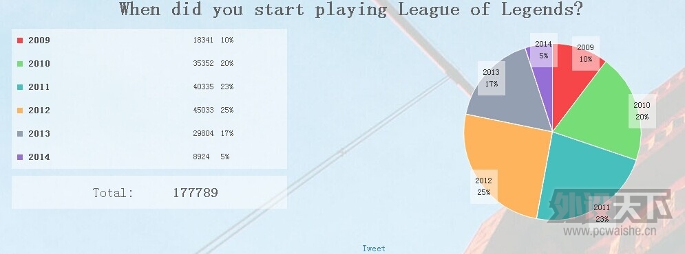 还记得你最开始接触英雄联盟是什么时候吗?2012赛季?2013赛季?或是刚玩不久?英雄联盟陪你度过了多少个孤独寂寞激情欢乐的夜晚? 国外发起了一项关于“你何时开始玩LOL”的调查,约18万人参与。如图: ...