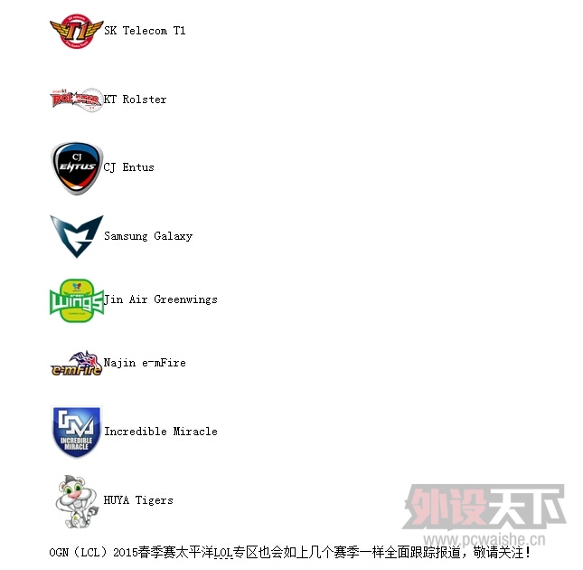 前几天我们报道了2015赛季OGN(LCL)季前选拔赛正式启动(相关新闻),四个小组的头名:Xenics、Incredible Miracle、HUYA Tigers(HUYA组建新闻)和Prime将决出两支队伍与OGN已定的传统6支豪强角逐春季冠军荣誉。 ...