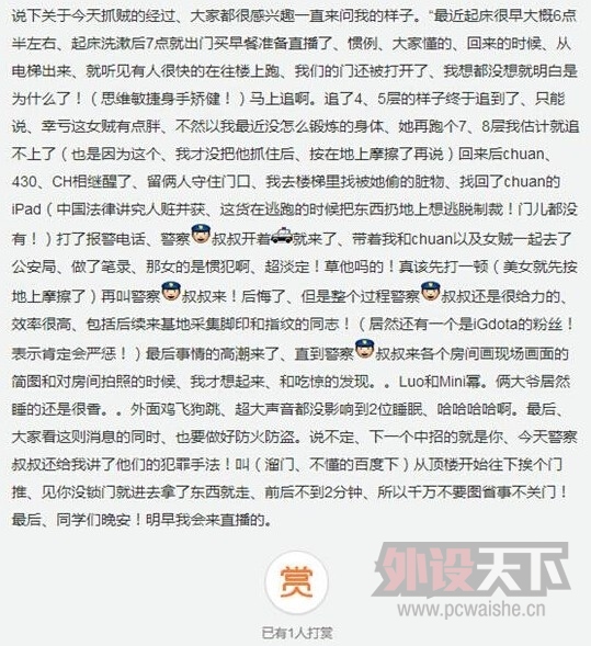 外设天下讯 11月25日消息,现在做领队不光要游戏打得好,外交做的好,还要善于捉贼,勇斗歹徒,在上周末iG战队DOTA2分部的领队错觉就遭遇这样一件事情,庆幸的同时也不免惊出一身冷汗: 全文如下: ...