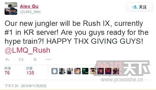 目前韩服排位第一的Rush IX会是我们的新打野,大家是否充满期待了呢?大家感恩节快乐!@LMQ_Rush 前LMQ战队的经理也透露过,原中单小微笑将会续签,而辅助位将有北美的路人Adrian担任。现在又有韩服 ...