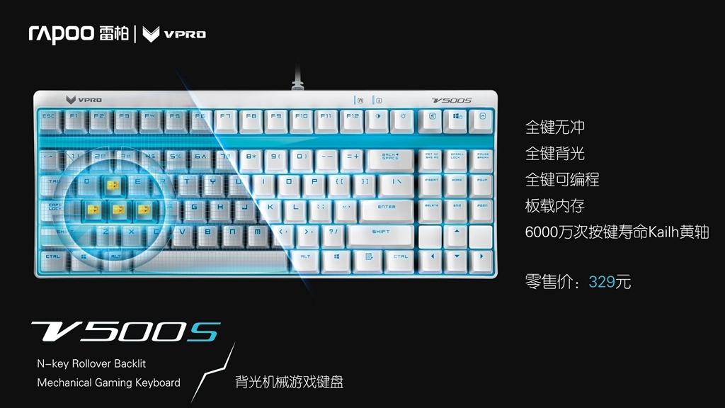 1、轴体、外观、背光、无冲、键帽、品牌、智能性,以上这些点,你在选购机械键盘时最看重哪些方面? 必须是外观啊,背光,品牌,轴体只要适合自己就好了,况且背光颜色轴体这些要是有一定的动手能力都可以自定义,还有品牌,想当年入的第一把V500主板被我钻孔,飞线,改轴,改热拔插,依然坚挺!!! 2、简单说一下你对雷柏V500S的印象。 简洁大方,最重要的一点是让所有喜欢V500又碍于没有灯光的玩家们有了一个多的选择。不需要飞线 也能拥有背光板的V500,而且质量有保障,飞线没有灯控很难受。而且还有保修啊 有木有!! 3、晒晒你现在拥有的键盘。 拥有一把Poker2茶轴,魔力鸭9008S3红轴,Face U青轴, v500黑轴,现在又在组一把GH60 无钢红。