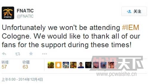 昨日,Fnatic战队在推特上宣布退出IEM科隆站: 很遗憾我们不能出席IEM科隆站,感谢这段时间一直支持我们的粉丝。 (来源:PCgames)