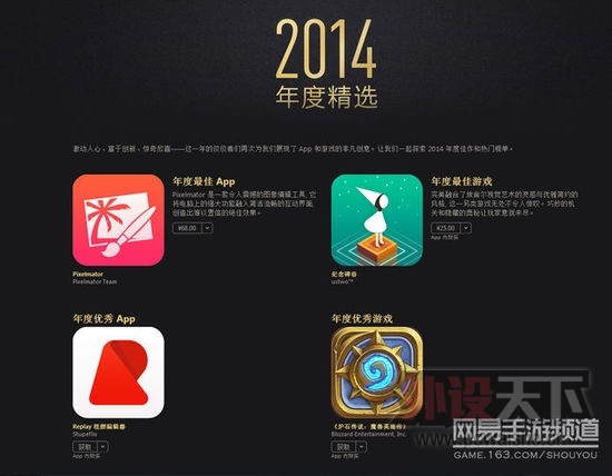 苹果AppStore公布了“2014年度精选”榜单,该榜单分为iPad和iPhone两个平台。《炉石传说》和《纪念碑谷》分别荣获iPad平台“年度优秀游戏”和“年度最佳游戏”称号。长期位于iPad畅销榜最前列的网易《乱斗西游》也成 ...
