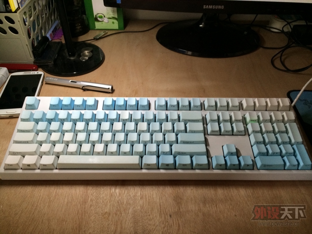 本帖最后由 xswang 于 2015-6-19 23:39 编辑 白色全灯,自己加的。壳子有两套,一套白的一套黑的。键帽两套,一套冰霜,一套灰色。都是侧刻。键帽二选一。樱桃轴