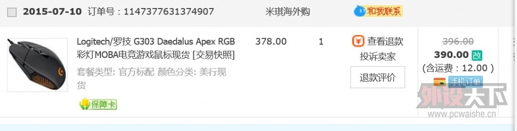 本帖最后由 tiancaijh 于 2015-7-11 12:27 编辑 不多说,包装都齐全。看图,.罗技G303,刚刚到手半小时,淘宝找的美行代购现货,390入手。上手不习惯鼠标对称设计,还是喜欢kone pure的手感。故趁热出,价格300顺 ...