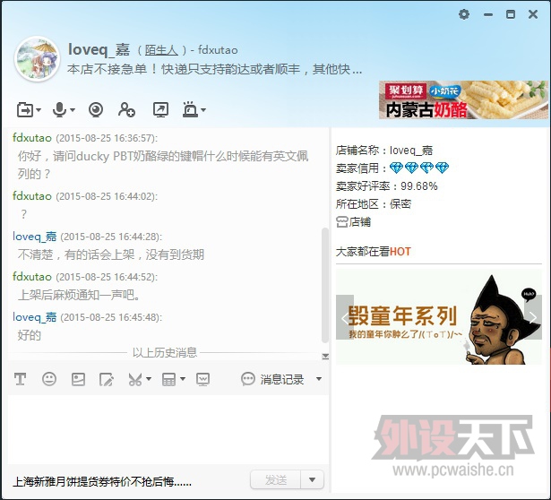 prokatze 发表于 2015-9-10 22:16 1,我的是全新未拆。 2,淘宝上两家,卖349的没有英文字根现货,卖329的是台湾发到大陆的顺丰到付。