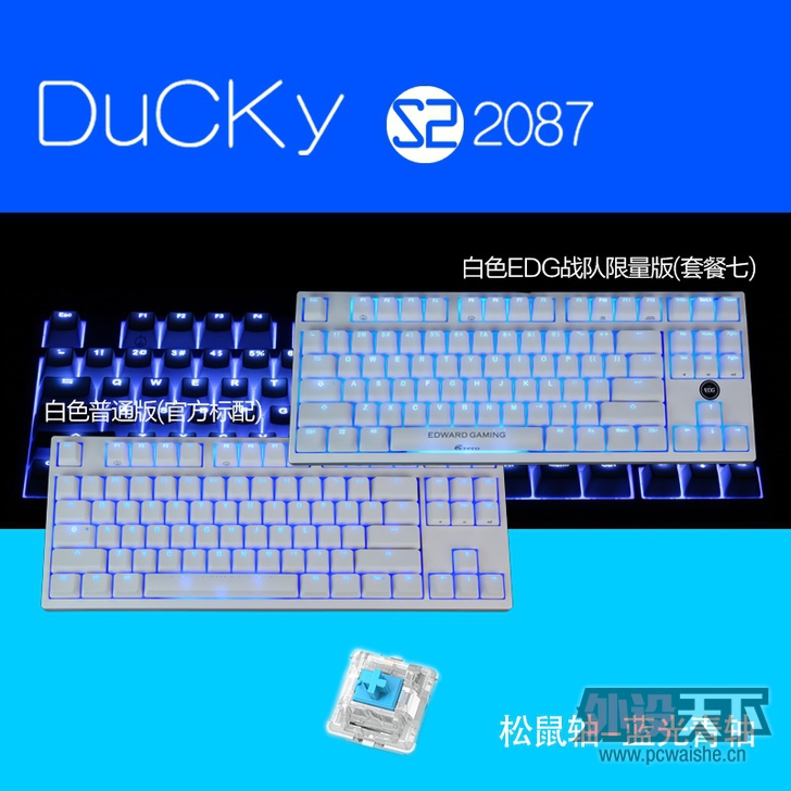 魔力鸭2087S2,白色蓝光松鼠青轴。啪啪啪的不二选择。 2015.8.8入手。有保箱说全。 购买赠送原价99的蓝色迷彩水转印外壳。以及F区一排紫色字透光键帽。原装回车键帽找不到了,赠送LOL金克丝字透回车键帽。 自用的 ...