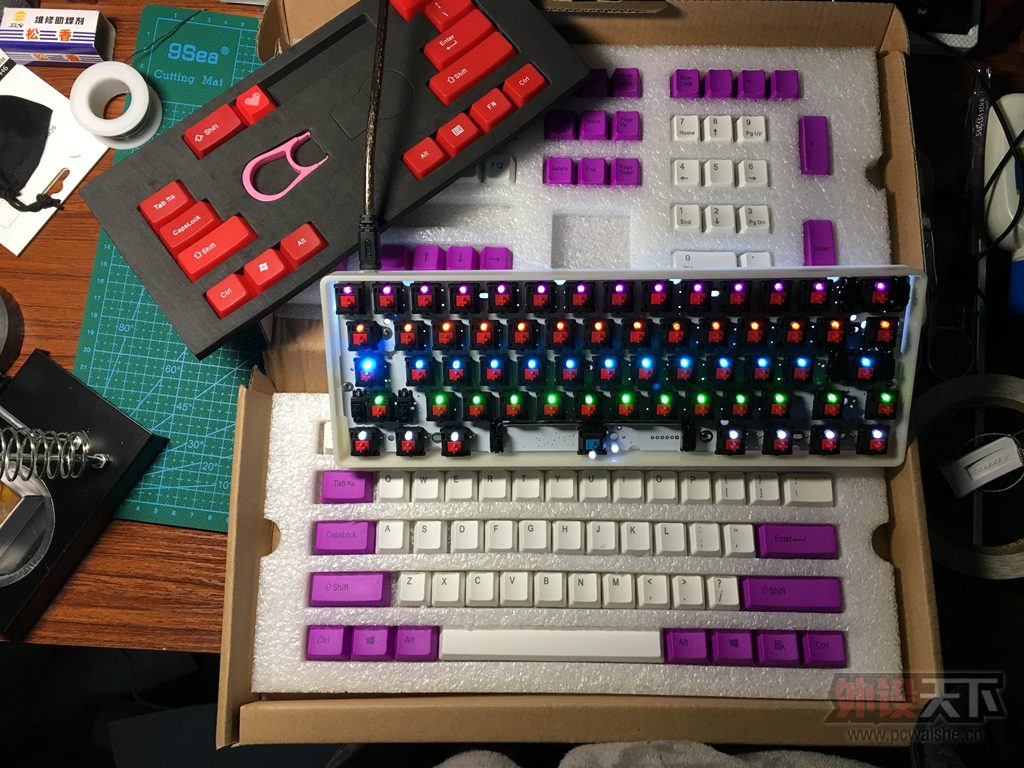 本帖最后由 HunterLi 于 2016-2-1 08:07 编辑 bface,背面增加了一条灯带,共16个灯,全高乳壳,樱桃红轴,空格为樱桃黑轴,热插拔灯位,卫星轴未调教,需要拿到手自己搞。一套自己浸染的PBT键帽,一套垃圾ABS大 ...