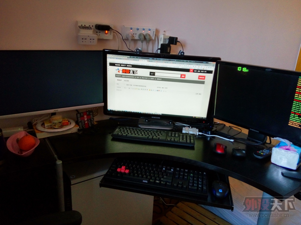 上图是我现在主要的办公区和娱乐区,下面键盘托架上的是鸭子的2108,桌子上的键盘是罗技的无线。 我常常的姿势是靠在椅子上,把脚放在桌子上,把键盘放在肚子上,鼠标放在椅子右扶手的鼠标托盘里(画面请自 ...