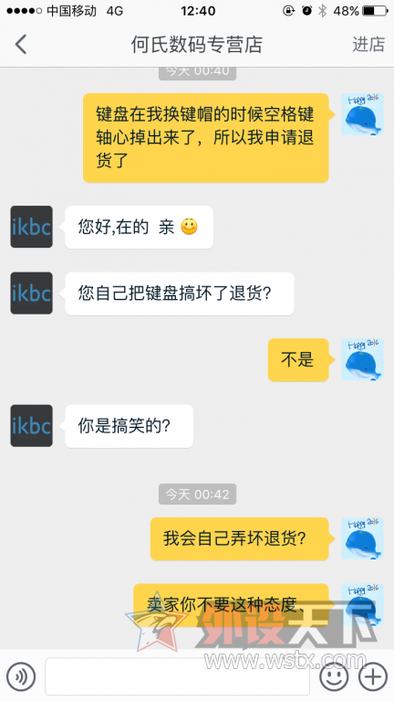 这种事情的两面性太强, 如果真是品质问题买家很耐受,如果人为原因店家很冤枉,但店家的态度不像是在做生意,即使不是店家原因,这种态度会产生非常差的负面影响,会让一些人望而止步,嘲讽拉仇恨的,团战可以输,提莫必须死~~~~~ 如果LZ坚持产品愿意,必须有足够的证据,比如制造商或第三方检测机构的鉴定,根据损坏部位是可以分析出原因的,但是在天朝国度里,够呛了,客服承诺免费维修,算是最好的结果了, 再有天猫介入也就那么回事,牛X店铺都不屌这事,遇到过买鞋有毛病客服连回复都没有,压根不搭理我,拳拳打在空气上,更憋屈,差评看不到自己评论,照片不能上传, 猫猫的金主是卖家,都是亲儿子,凡事当一次小白不算问题,经历才能成长。 IKBC客服不错,赞一个 |
