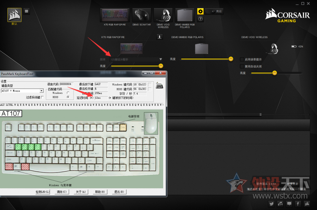 拿K70作为测试对象 测试的方法是 4个键同时按 看图1: 调成1000HZ 延迟果然低得很 我手上大多数游戏键盘 基本都是这个值 想在游戏里面快人一步 那么这个值不要忽略!