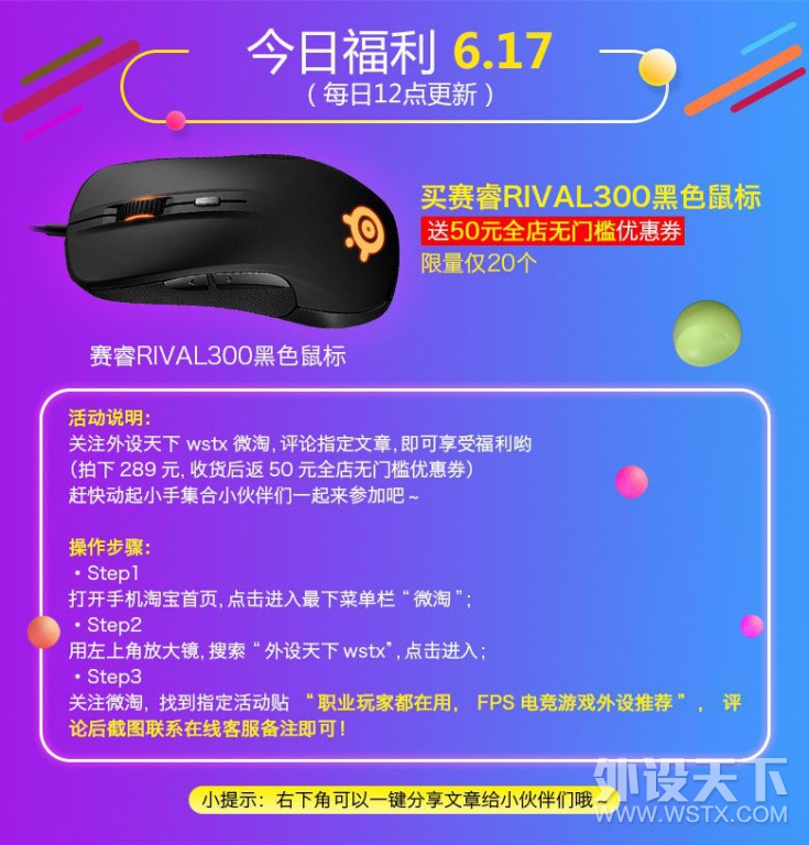 【每日福利】2017.06.17 买赛睿RIVAL300黑色鼠标 送50元优惠券