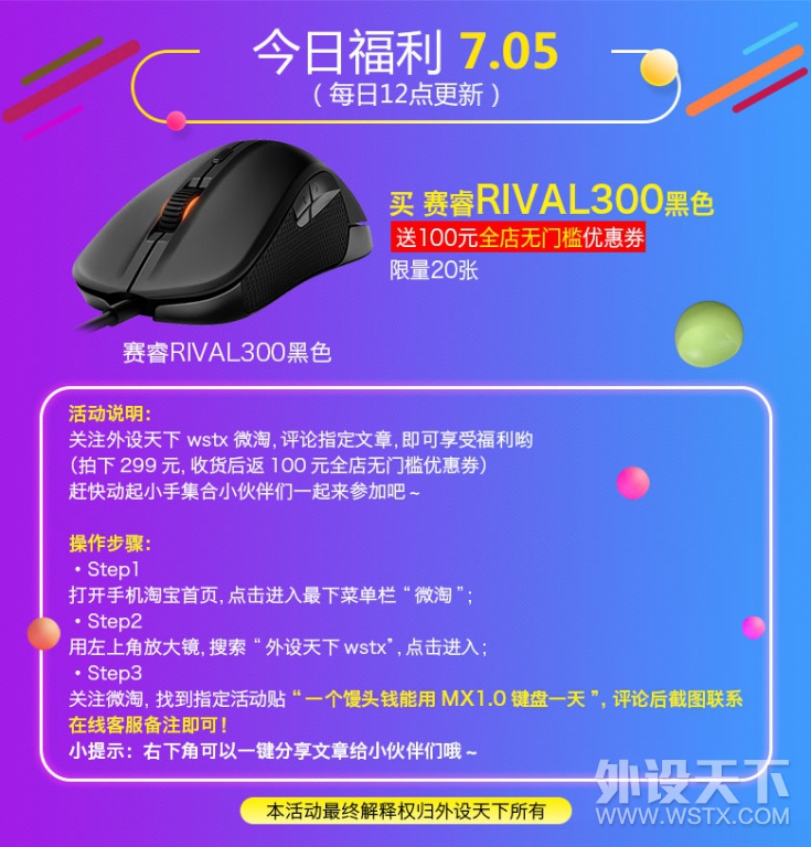 【每日福利】2017.07.05 买赛睿Rival 300黑色 送100元优惠券
